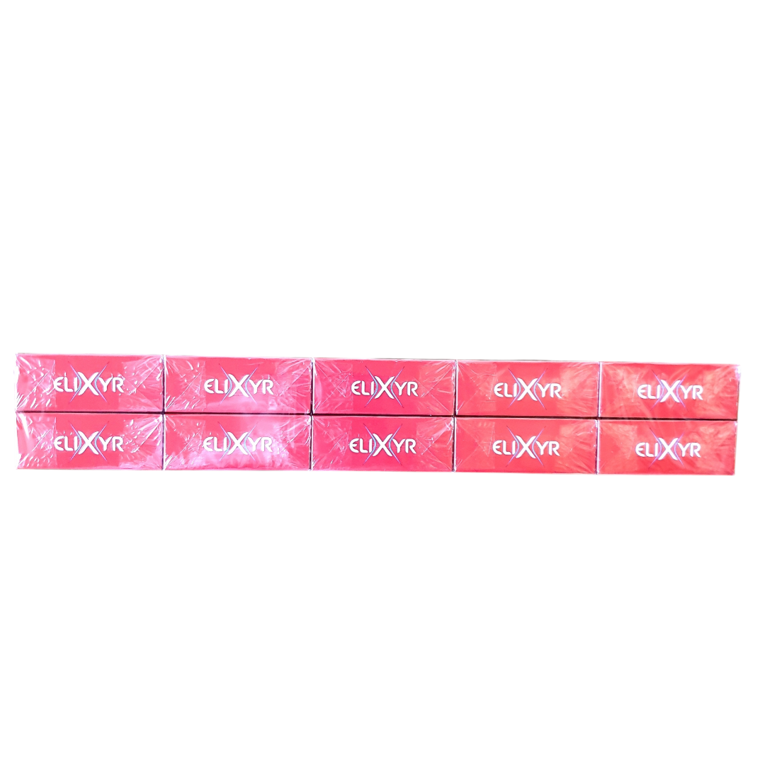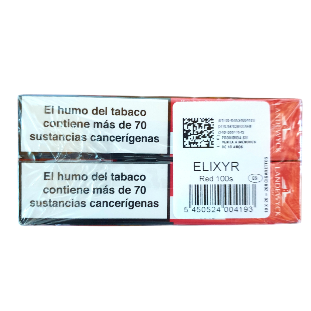 Elixyr Red 100s are cigarettes designed to deliver an intense smoking experience with a rich, full-bodied tobacco blend. This product is aimed at smokers looking for a full, pronounced flavor, characterized by a high nicotine content. Elixyr Reds stand out for their robust flavor profile, ideal for those who enjoy a cigarette with a powerful, distinctive taste.